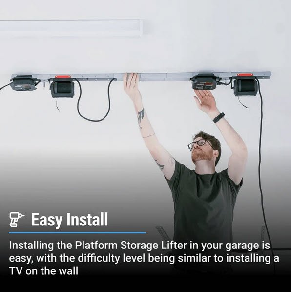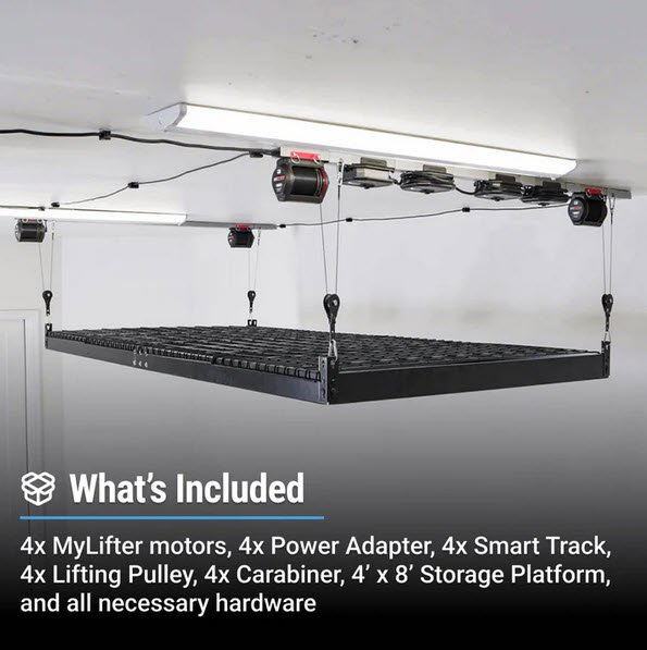 With a mesh wire platform, the 4×4 Platform Storage Lifter can lift awkward and heavy items, such as lawn tools, woodworking tools, totes, and holiday decor. All four MyLifter’s sync to give you a smooth and seamless lift and lower, even with multiple items.