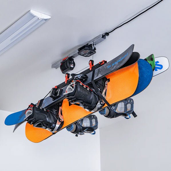 Maximize your garage space with the Universal Lifter by storing large items on the ceiling. The Universal can lift 100 lbs including the lifting accessory. Move items out of your walkways or parking spots. Lift and store an array of different items. The possibilities are endless. Lift anything like snowboards, skis, Power Wheels, lawnmowers, kayaks, bike racks and more.
